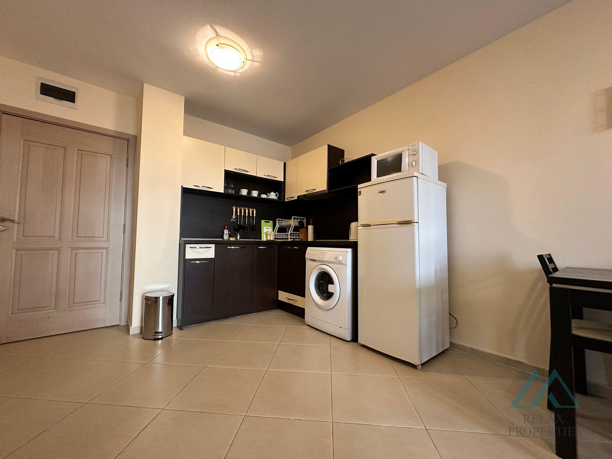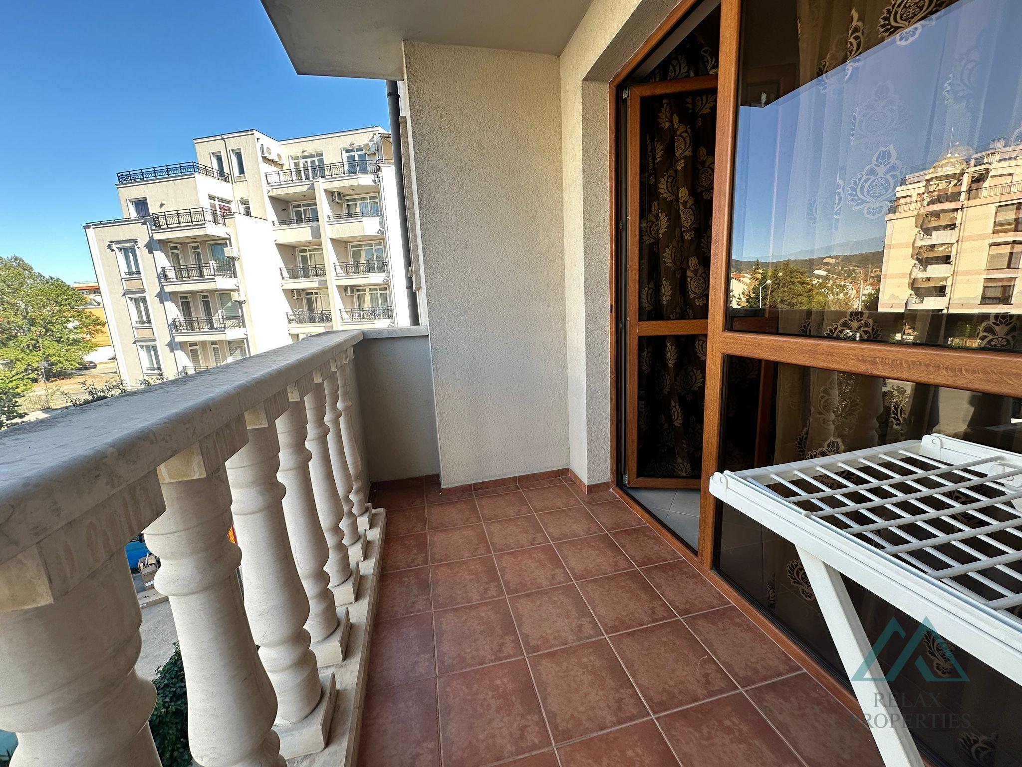 Reference number: B_9088 We offer for sale a spacious 2-room apartment with an area of 61 m², located on the 3rd floor of 7 in the modern Kalia apartments complex with an elevator in the center of Sunny Beach, only 400 m from the sandy beach. The complex is located a 5-minute walk from the Action Aquapark in Sunny Beach. The beach is only an 8-minute walk away. Excellent location, as all shops and currency exchange offices are right next to the complex. Excellent grill, bakery, market with fresh fruit and vegetables, pastry shop – all this is right below the complex. Nevertheless, Kalia apartments stand out for their tranquility and are located in an excellent neighborhood. Apartment layout: hallway, kitchen connected to the living room and dining area, separate bedroom, bathroom with toilet, and balcony with a pleasant view of the surroundings.