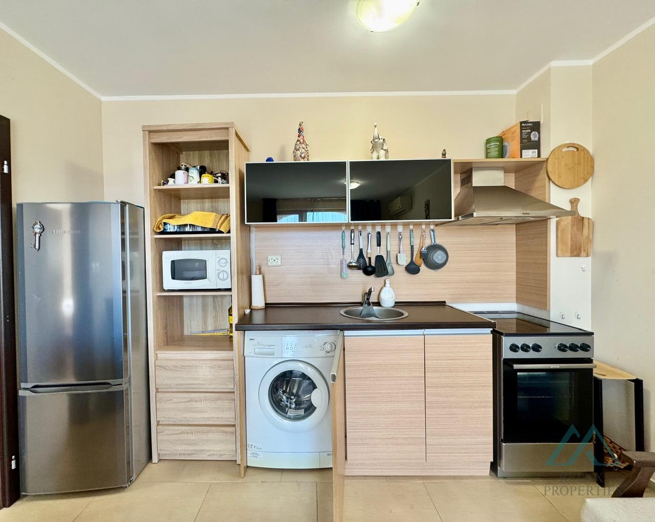 The apartment is fully furnished and equipped – the kitchen has a large refrigerator, washing machine, stove, microwave, and dining table. The living room has a TV with cable channels, a sofa, and air conditioning. The bathroom has a shower. The balcony is equipped with outdoor seating.