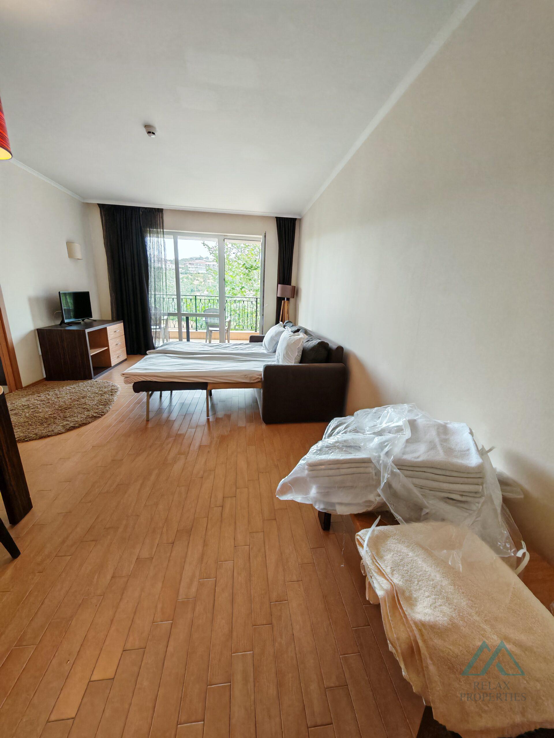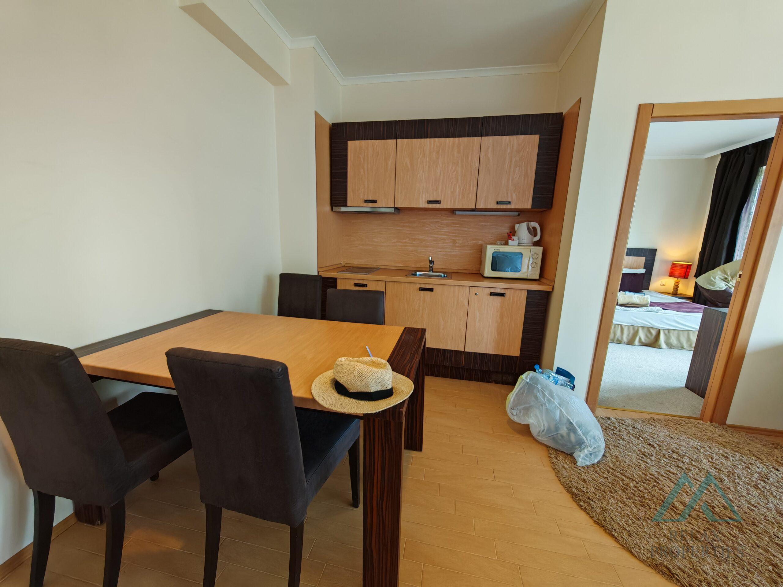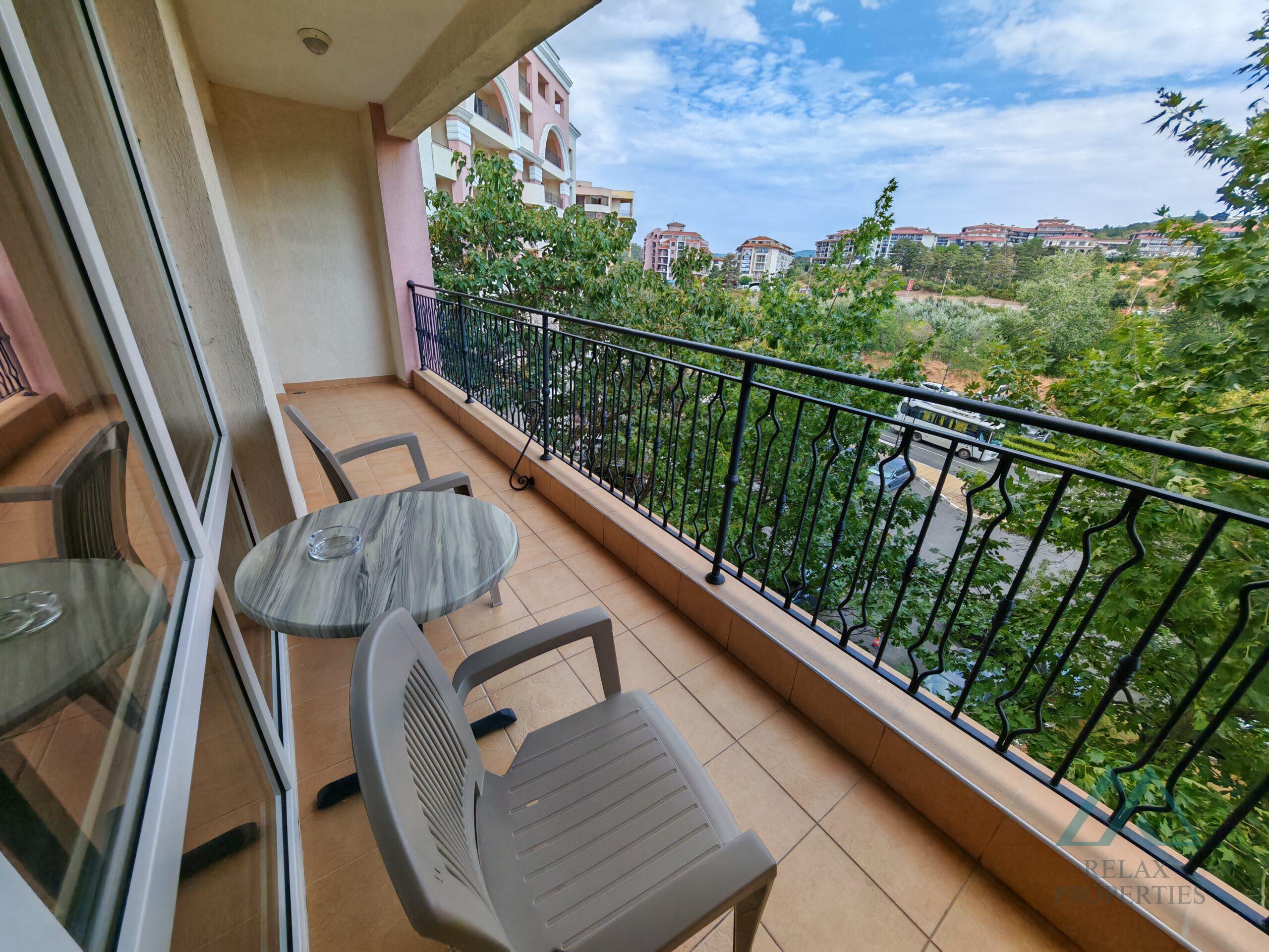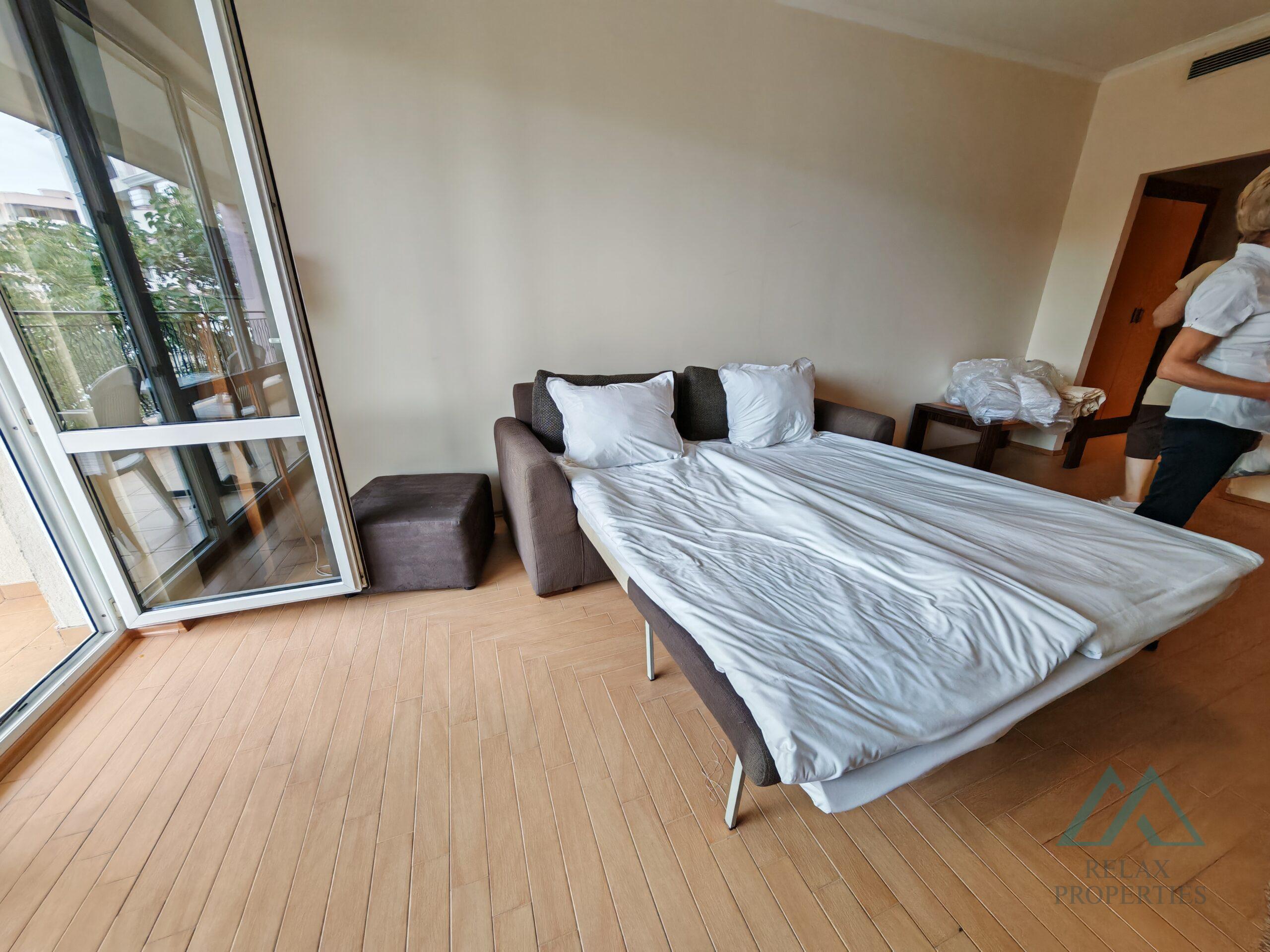 The apartment is situated on the 4th floor with an elevator and is oriented to provide a peaceful view of the park, which guarantees relaxation and privacy away from the main hustle and bustle of the resort. The apartment has a spacious terrace, ideal for sitting, relaxing, or dining with a view of the greenery. The interior is fully furnished and equipped, including a kitchen with appliances, a living area with a sofa bed, a bedroom, and a complete bathroom, allowing for immediate occupancy or rental.