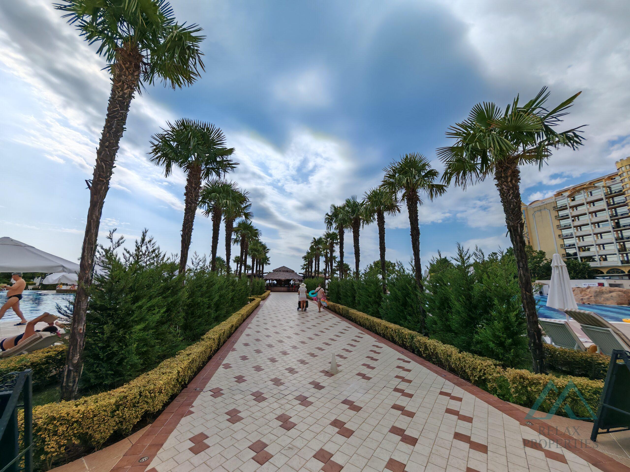Layout of the apartment: entrance hall, kitchen connected to the living room, separate spacious bedroom with access to the terrace, large terrace facing the rear – quiet part of the complex with views of the surroundings and greenery. There is only a dead-end street on this side of the complex. The annual management and maintenance fee is €12/m², payable once a year to the complex and includes care of the entire area (swimming pools, park, reception, security service, hotel maintenance, etc.). Apartment owners and their families can use all the resort’s facilities free of charge, including sun loungers, parasols, the fitness center, and entertainment programs. It is also possible to pay extra for meals – breakfast or a full all-inclusive meal plan.