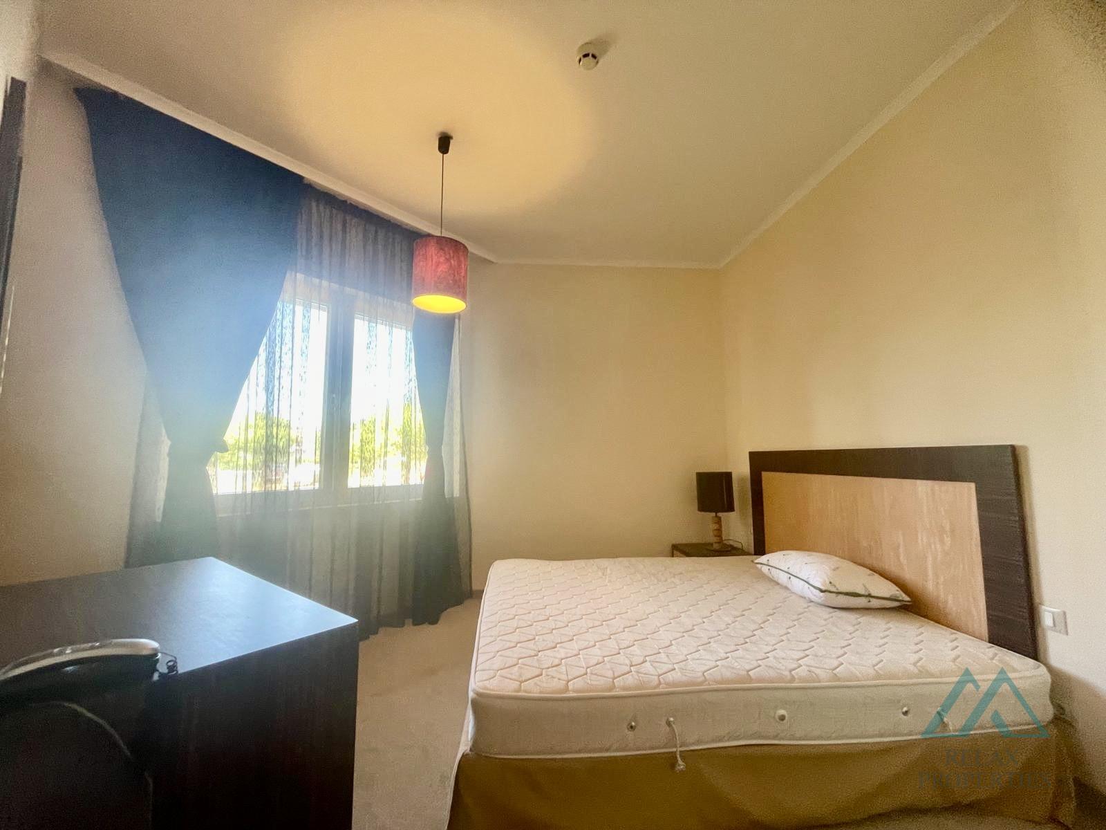 Apartment layout: entrance hall, kitchen connected to the living room, separate spacious bedroom, terrace facing the rear – quiet part of the complex with views of the surrounding area and greenery. There is only a dead-end street on this side of the complex. The annual management and maintenance fee is €12/m², payable once a year to the complex and includes care of the entire area (swimming pools, park, reception, security service, hotel maintenance, etc.). Apartment owners and their families can use all the resort’s facilities free of charge, including sun loungers, parasols, the fitness center, and entertainment programs. It is also possible to pay extra for meals – breakfast or a full all-inclusive meal plan.