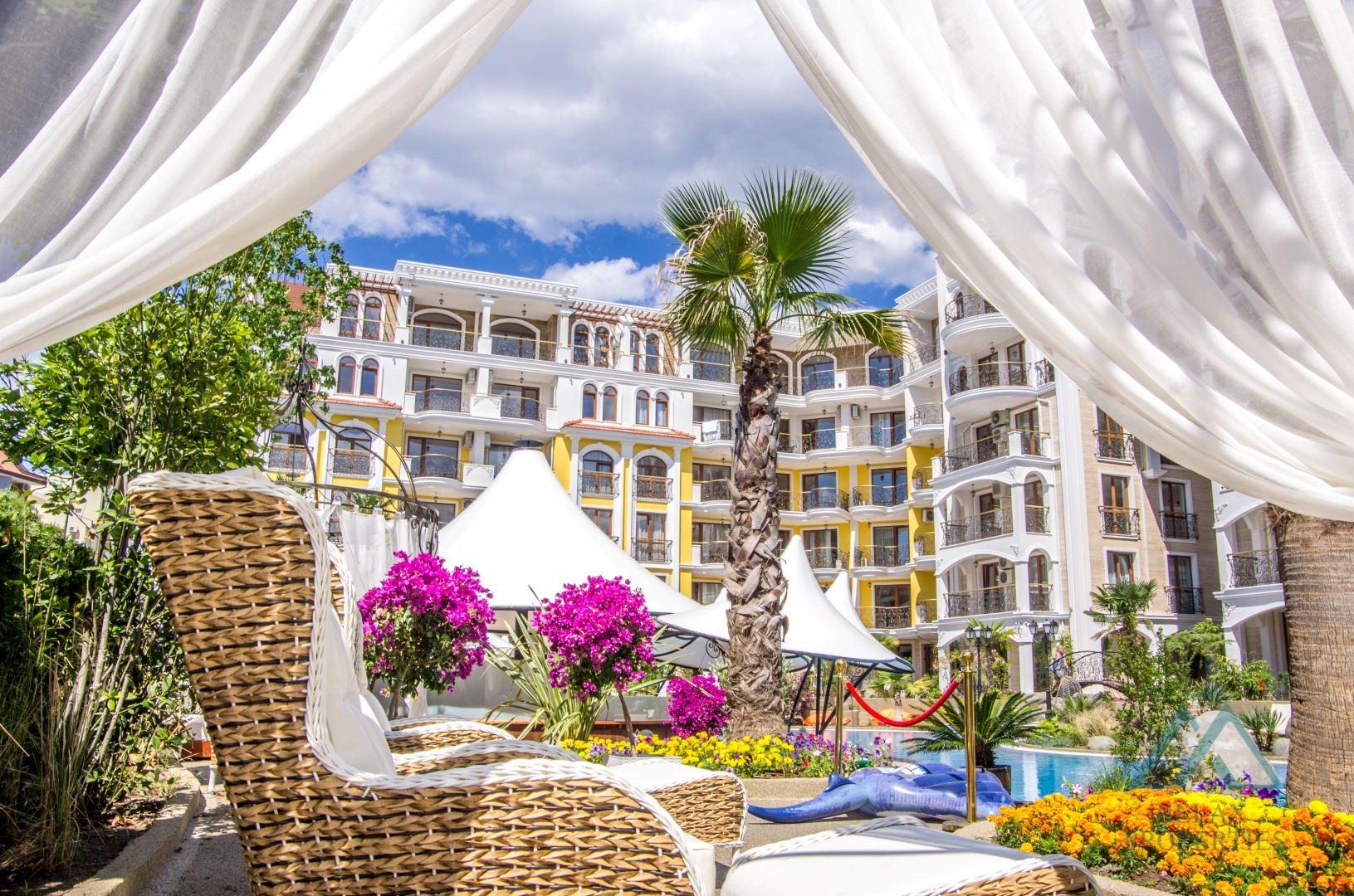 Harmony Suites – Monte Carlo is a luxury residential complex inspired by Monaco, consisting of three buildings (Harmony Suites 4, 5 and 6), two of which are connected by an iconic arch. It is located in the quiet and sought-after northern part of Sunny Beach, approximately 400 m from the beach and within walking distance of the center. The complex is known for its beautiful architecture, extensive green areas, high level of service, and one of the best wellness centers in the region.