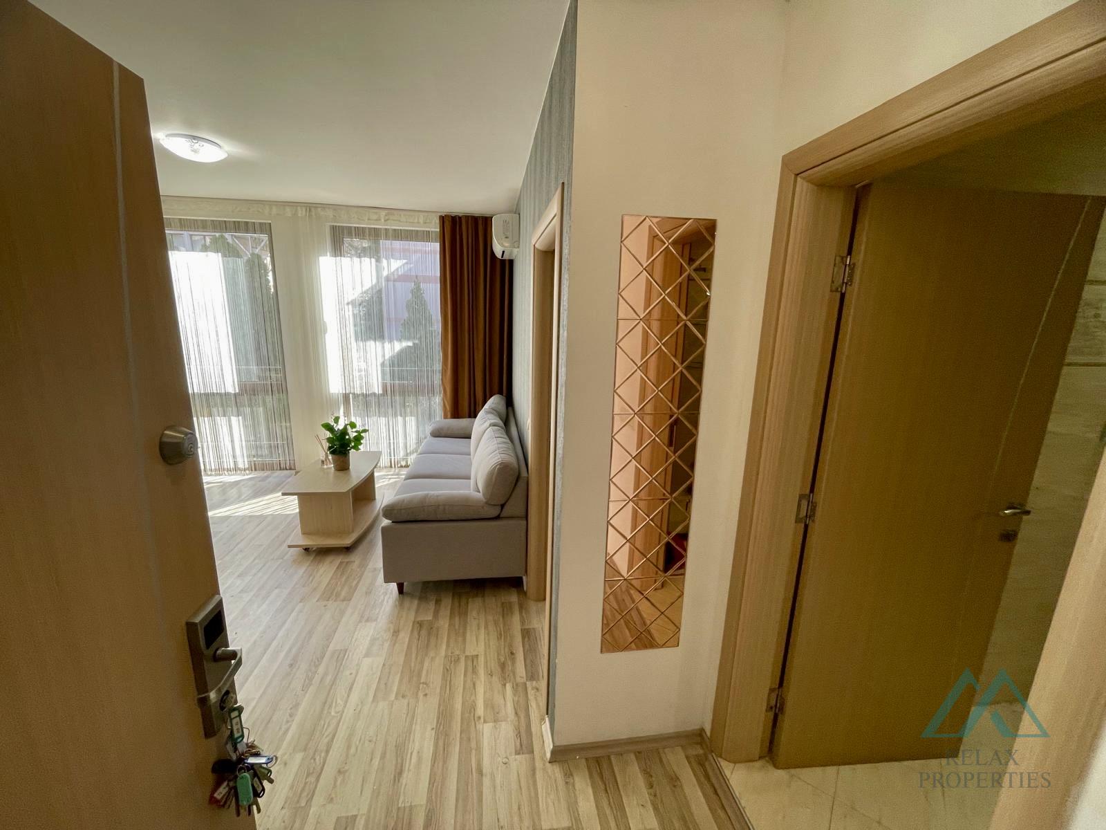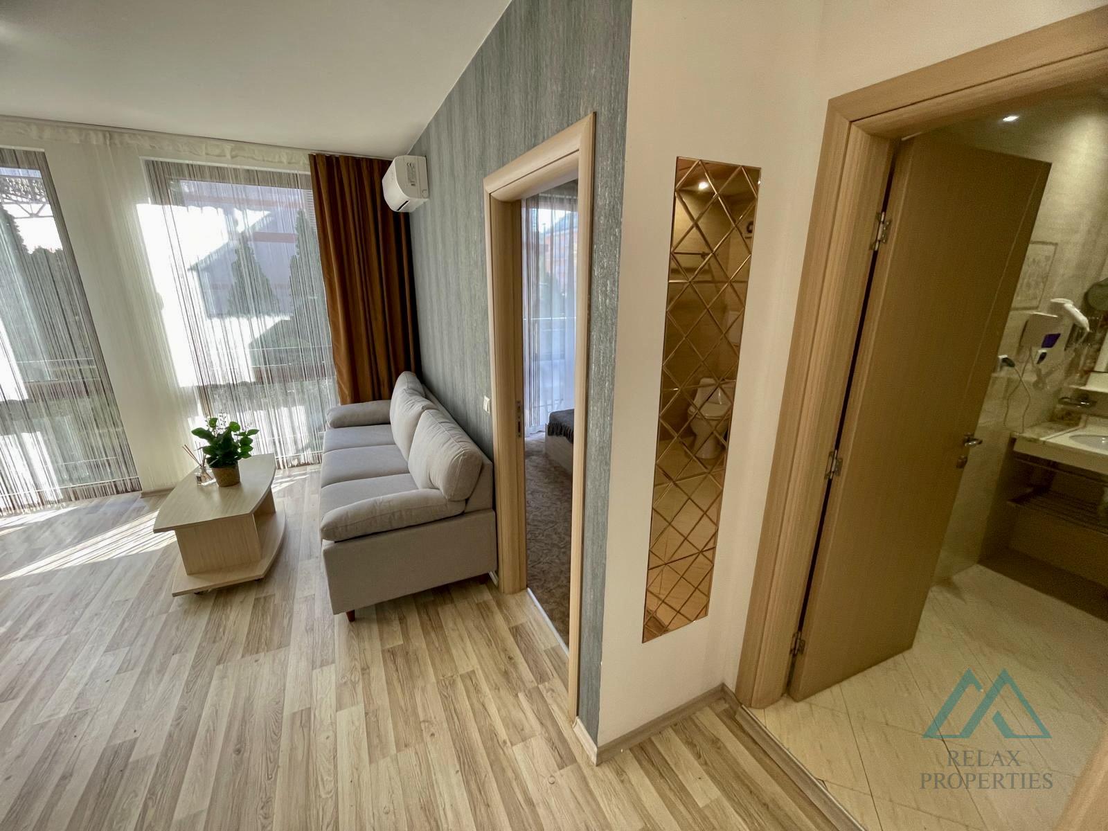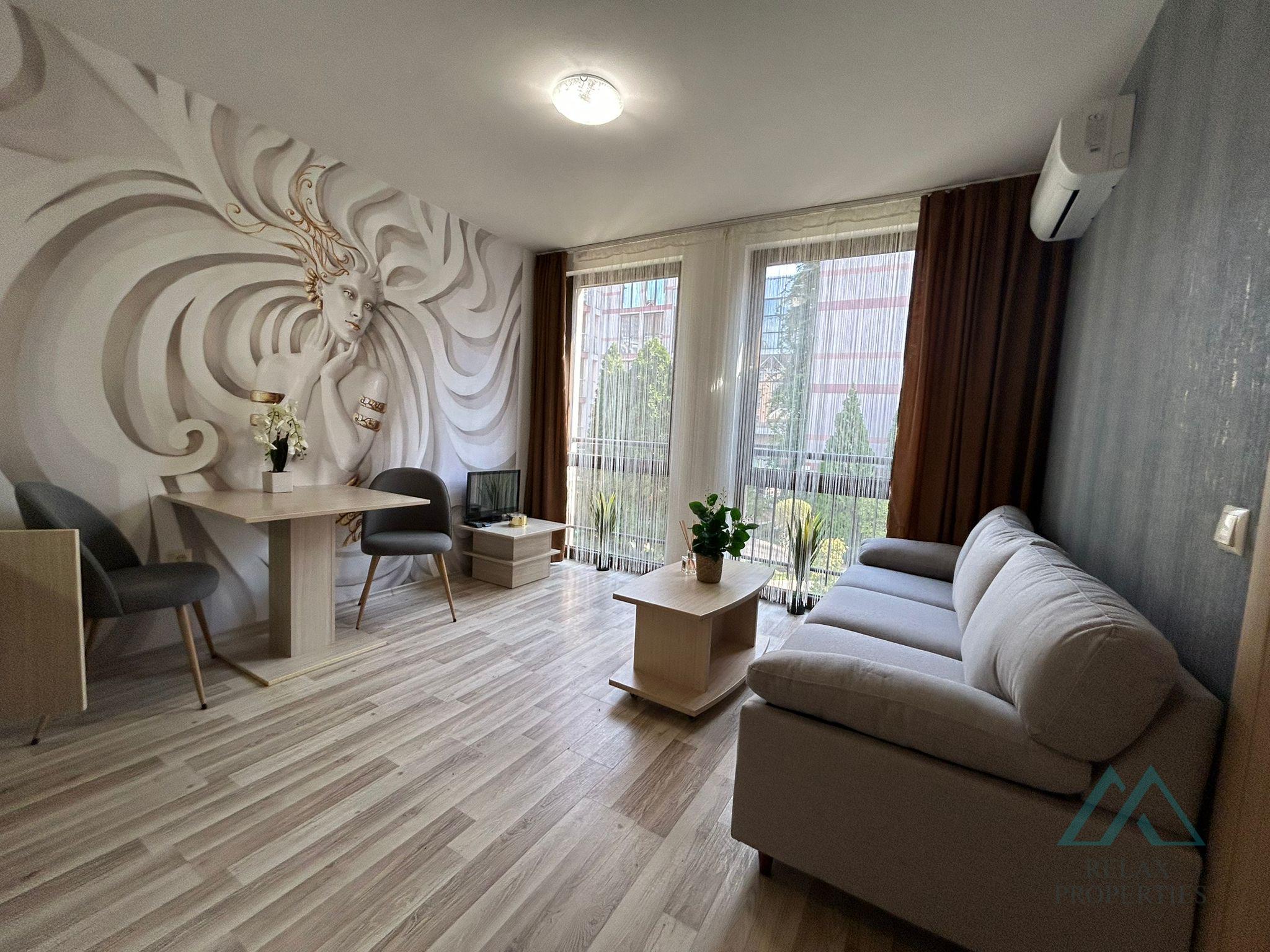 Reference number: B_3595 Certified real estate agency Relax Properties offers for sale an elegant 2-room apartment with a total area of 42 m², located in the prestigious Tarsis Club & SPA complex in Sunny Beach, Bulgaria.