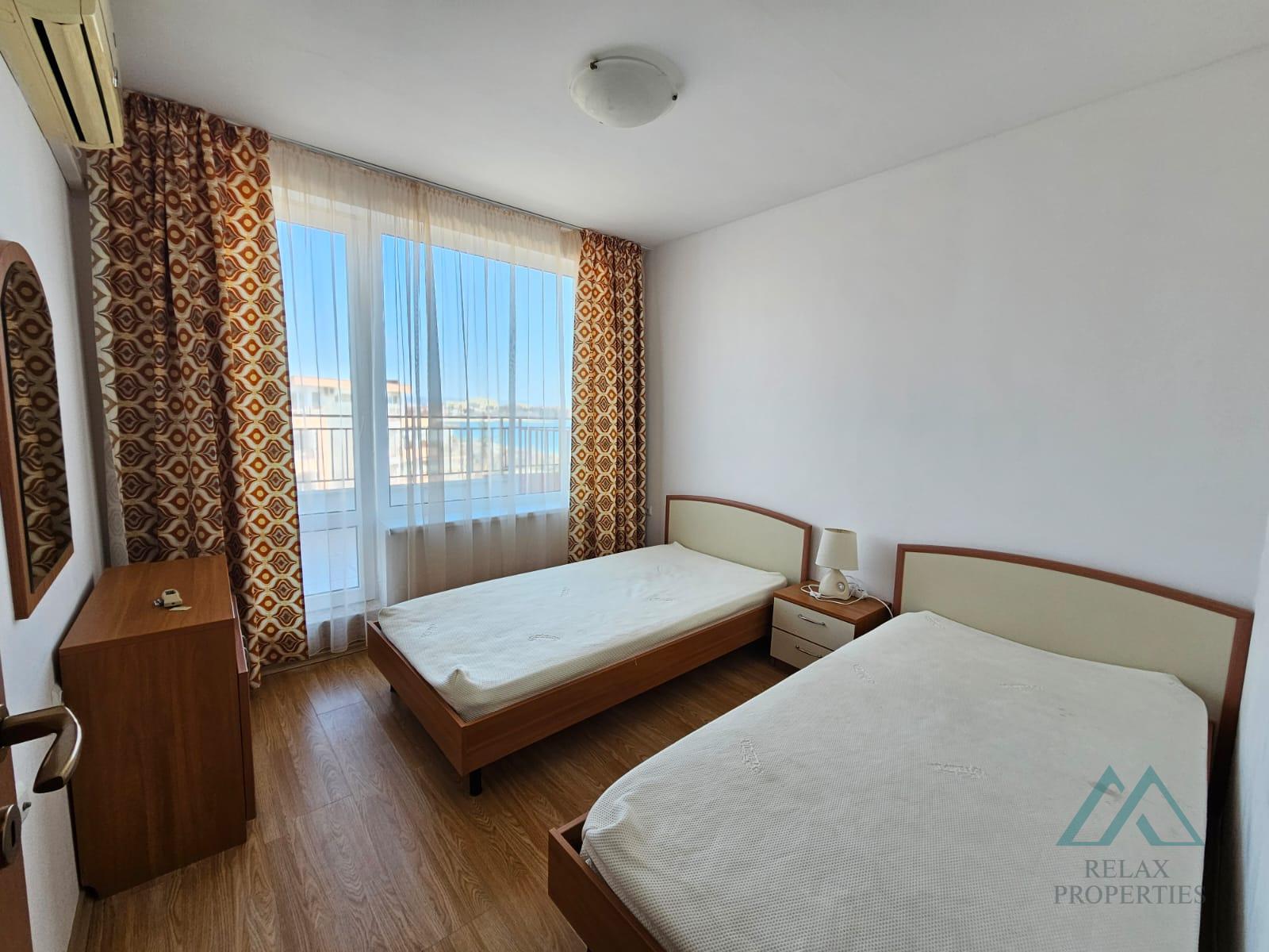 For sale we offer a 2-bedroom apartment on the top floor with 112 sqm and a large terrace with sea view, located on the first line by the sea in the prestigious Riviera Fort complex in the quiet village of Ravda, Bulgaria.