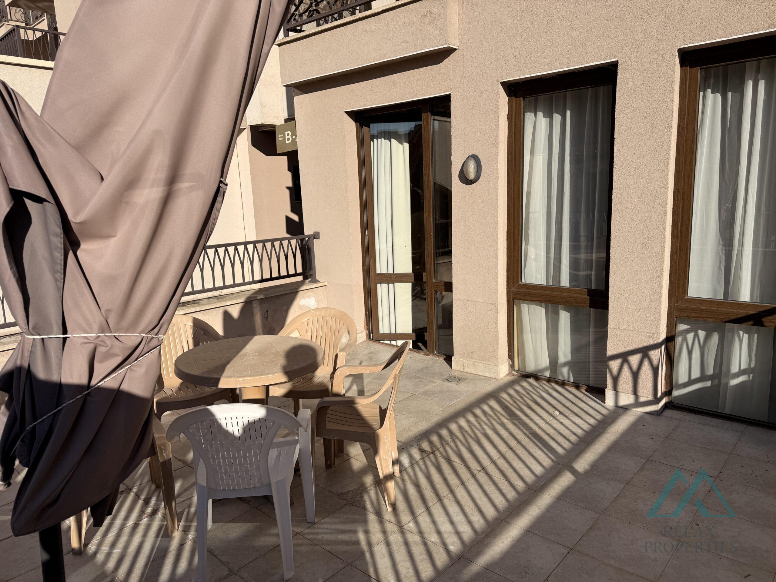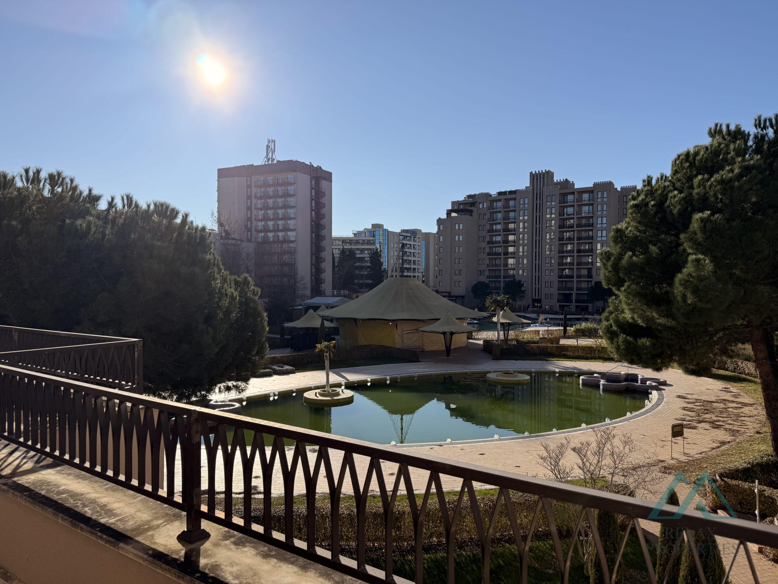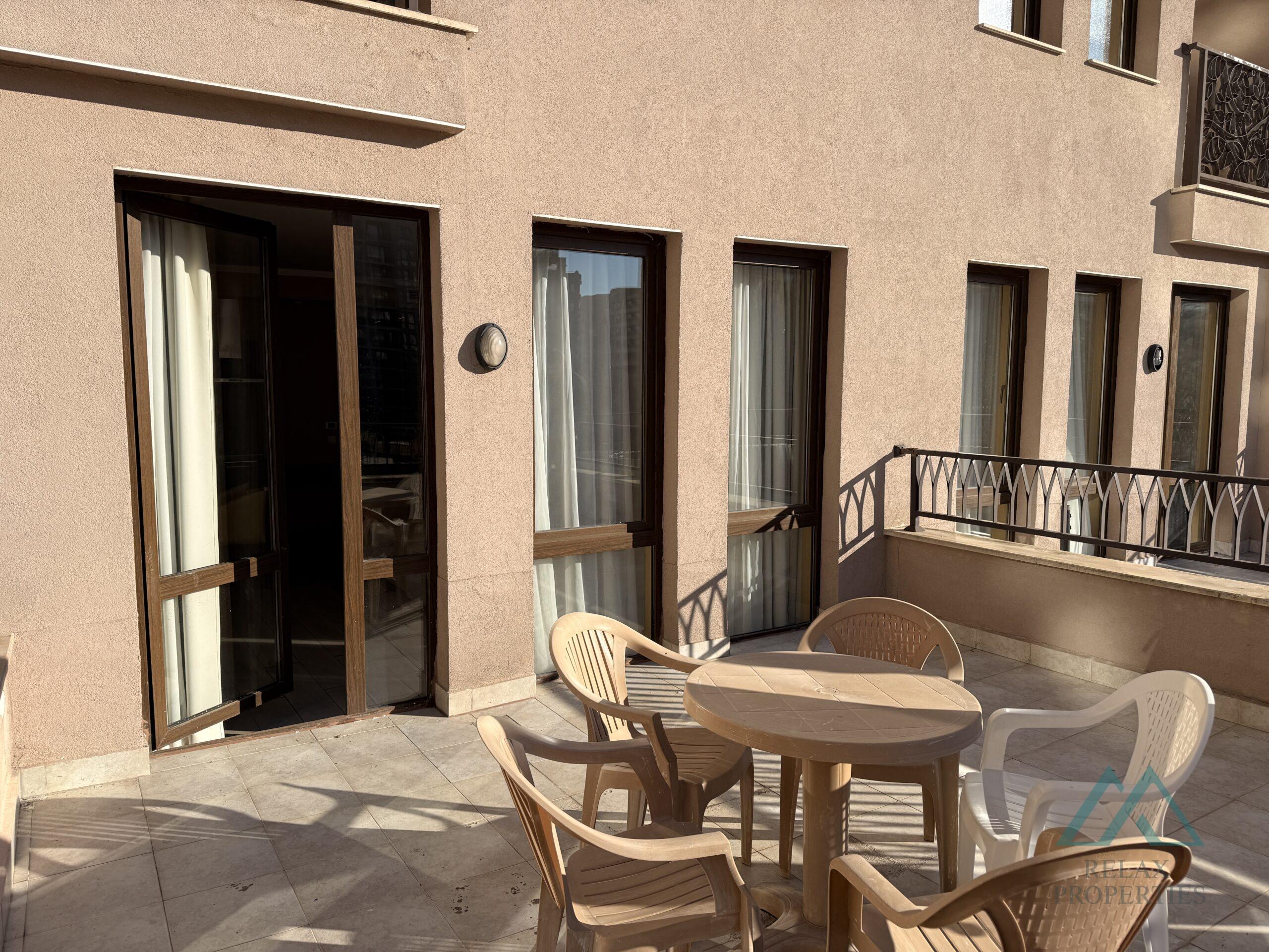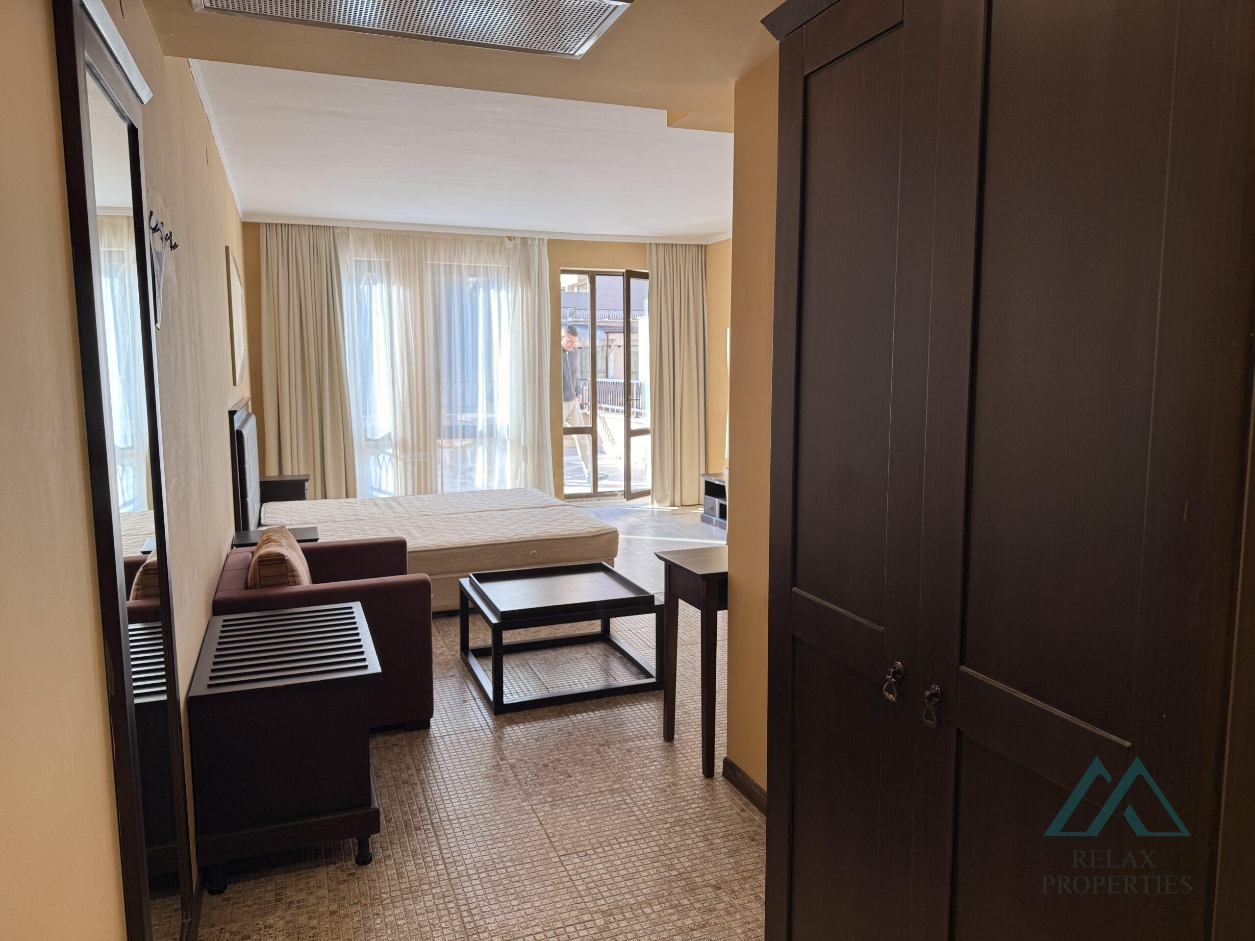 Relax Properties, a certified real estate agency, offers for sale a modern, spacious studio with a large terrace overlooking the pool, located in the prestigious 5-star Barcelo Royal Beach complex, right on the seafront in the center of the popular resort of Sunny Beach, Bulgaria.