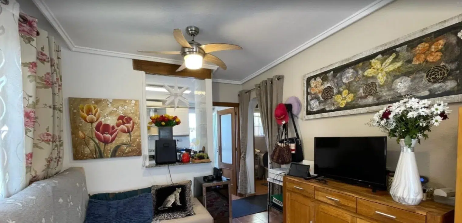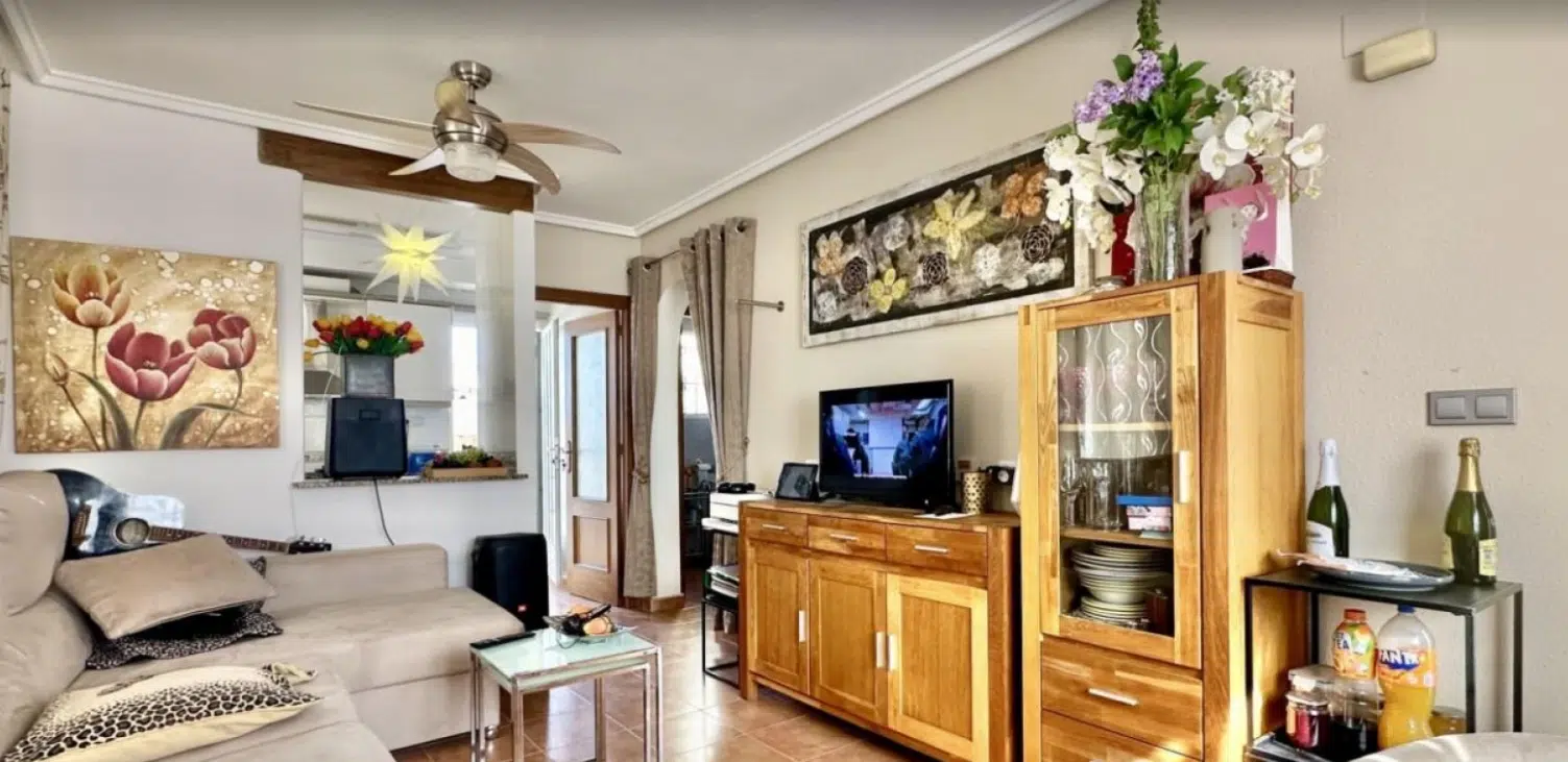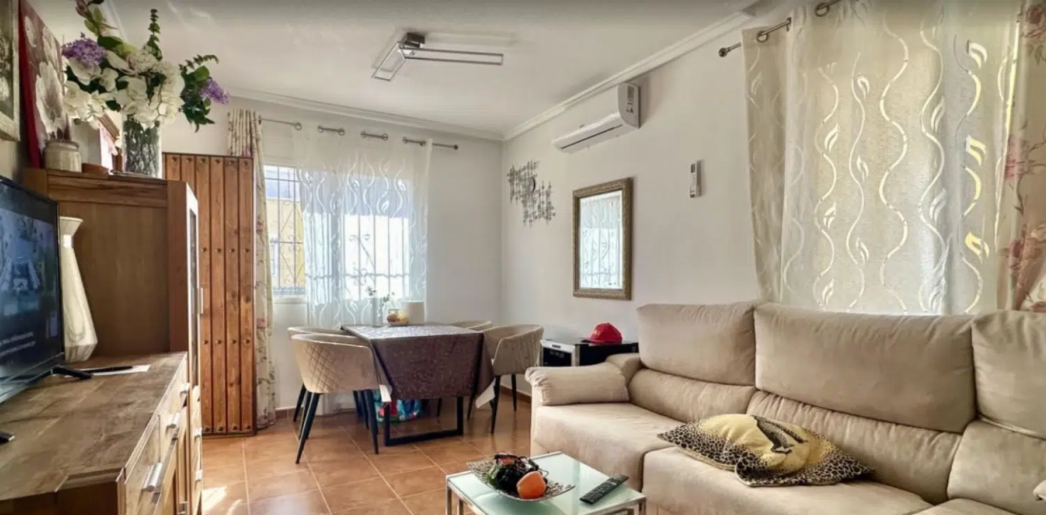 The house has 3 bedrooms, 2 bathrooms, a spacious living room with kitchen and a private roof solarium, ideal for sunbathing all day and outdoor seating with views of the surrounding area. The complex also includes a communal swimming pool, providing comfort and relaxation for the whole family. The location is close to Playa Flamenca beach, restaurants, shops, and all amenities, ensuring a comfortable life by the sea all year round.