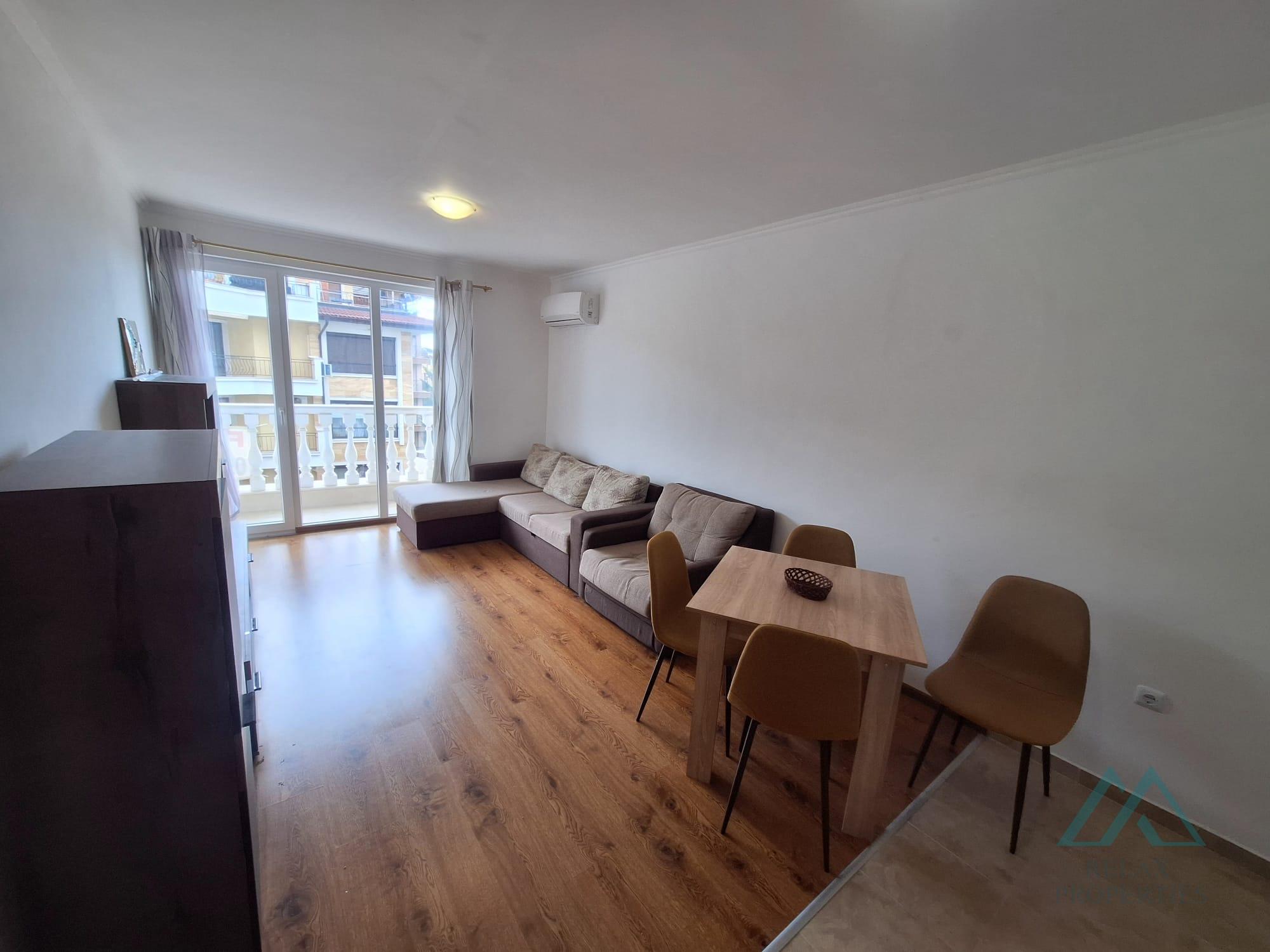 The apartment is located on the 4th floor and has a total area of 57 m². The layout consists of a living room with a kitchenette, a separate bedroom, a bathroom with toilet and a balcony with a beautiful sea view.