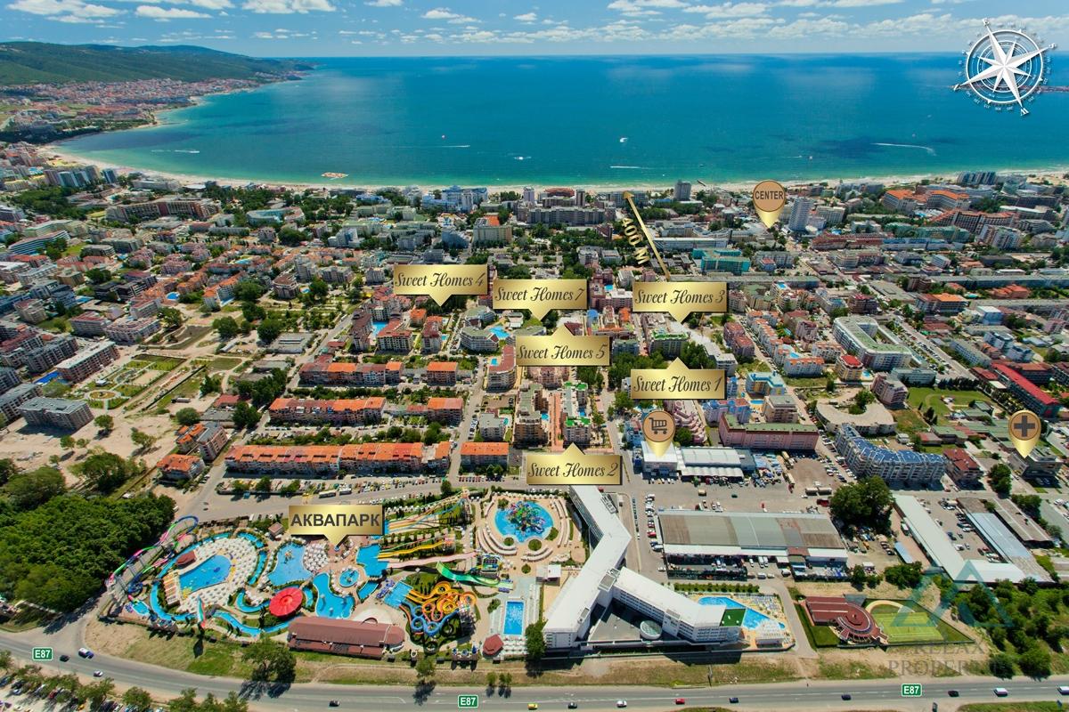 The Sweet Homes 5 complex is located near the center of the resort, where you will find many shops, restaurants, bars, and attractions. The Action Aquapark and the popular Jani restaurant are also nearby. The beach is only 500 meters away.