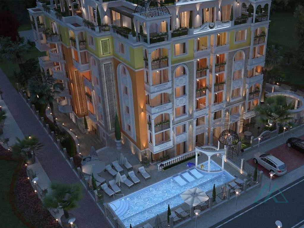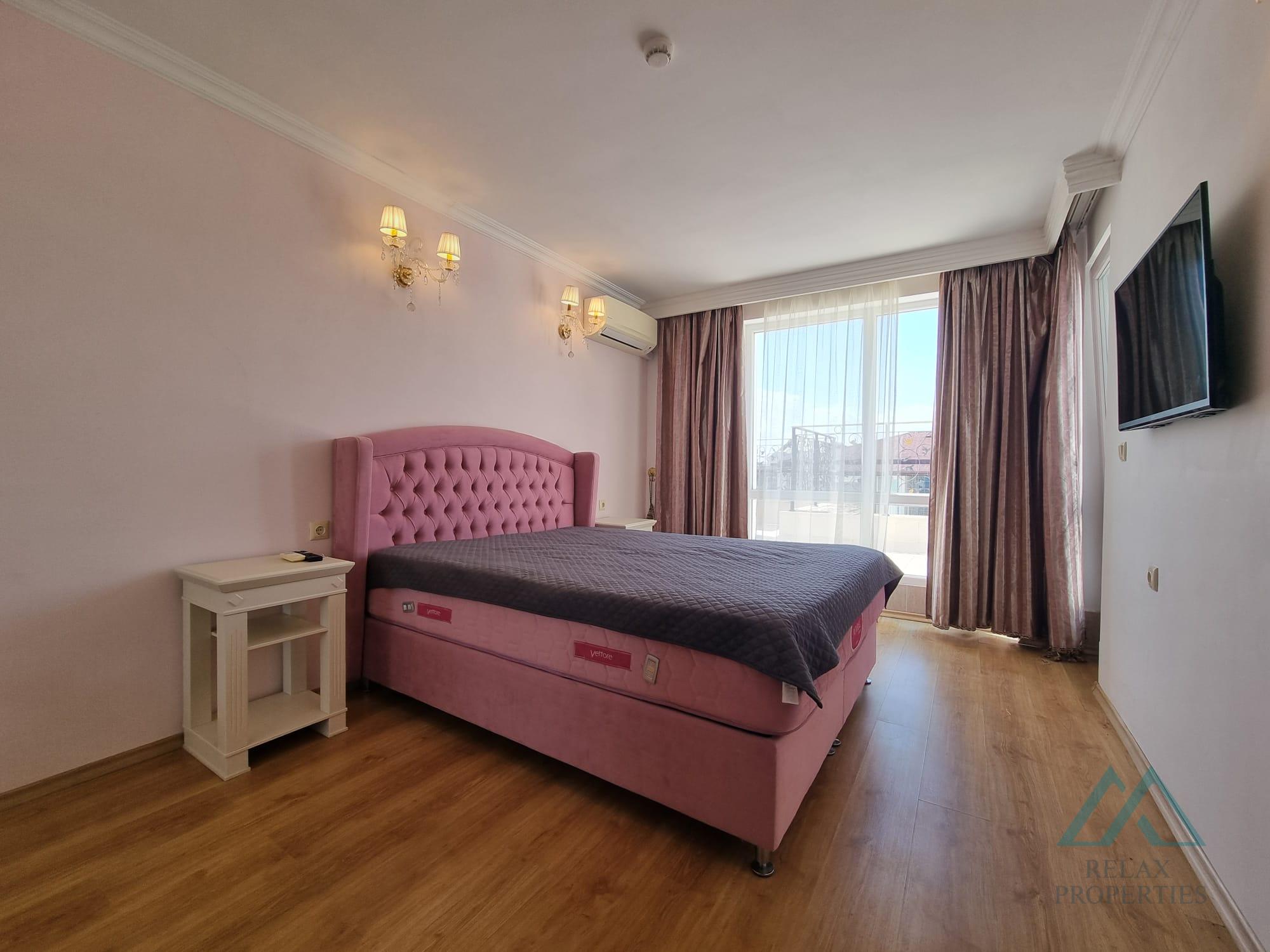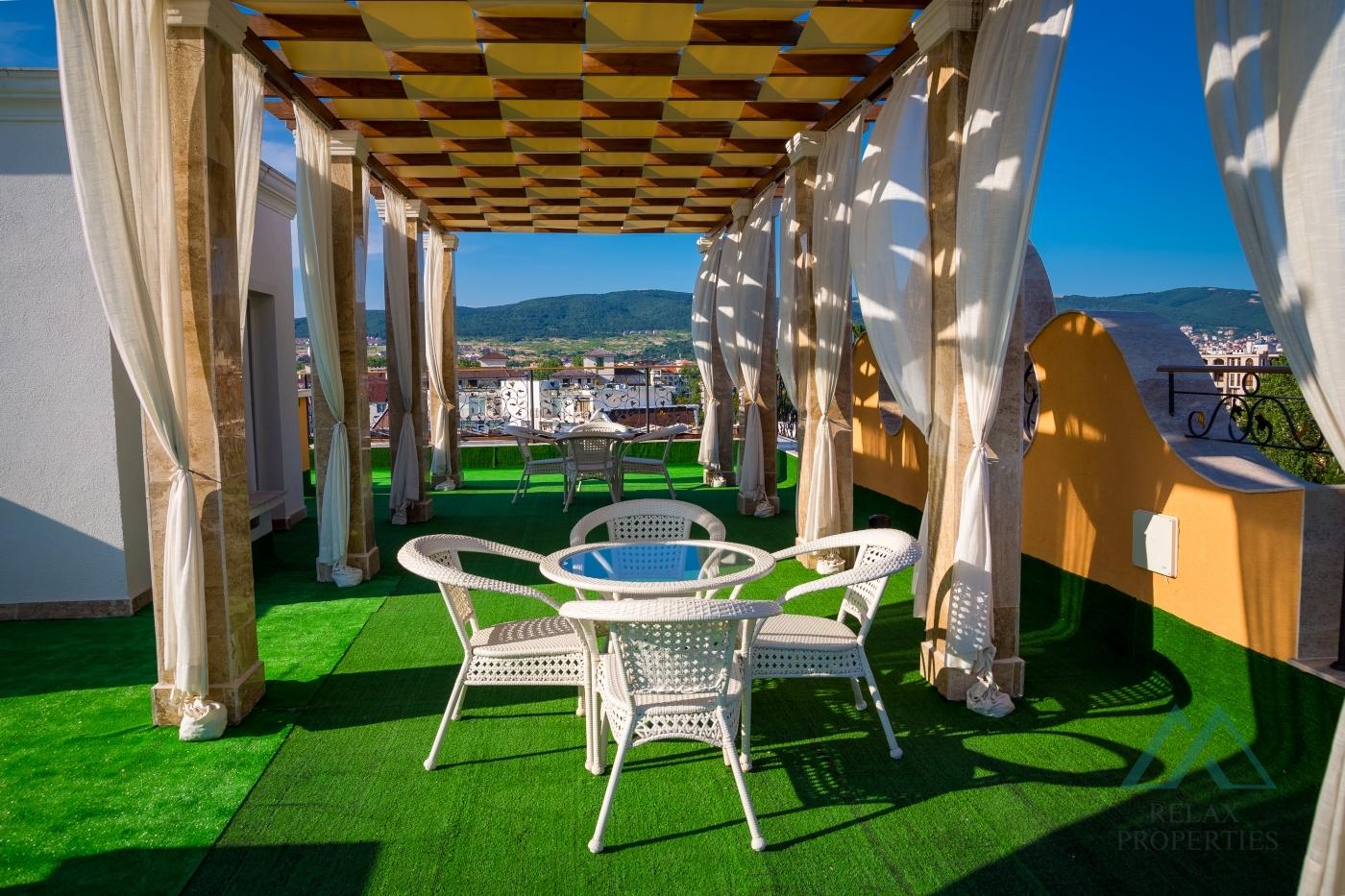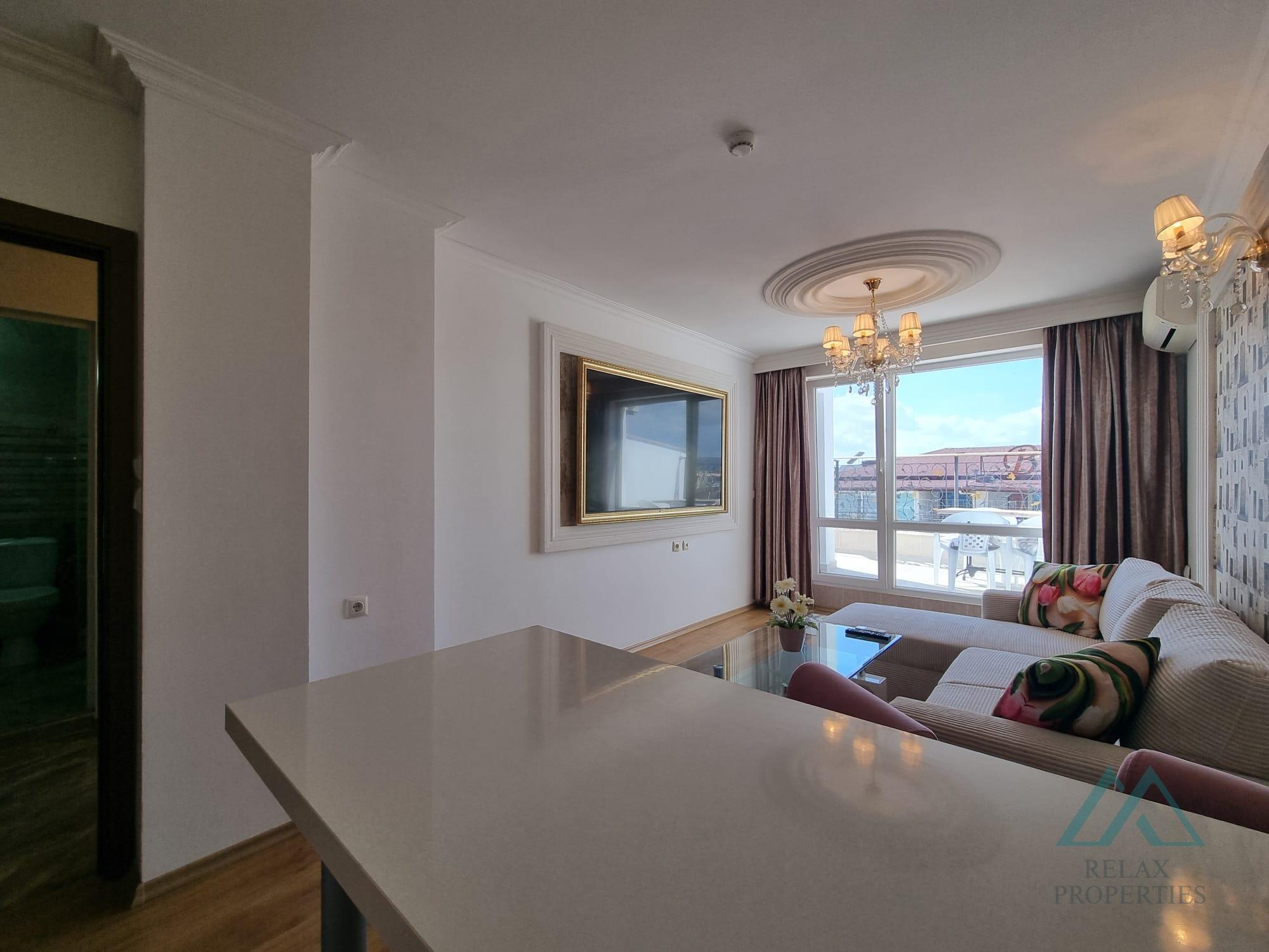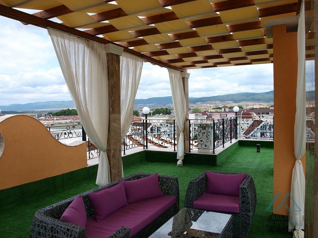 Reference number: B_3543 We offer for sale a beautiful 2-room apartment with an area of 68 m² and a large terrace with panoramic views, located on the top floor of the prestigious Sweet Homes 5 complex in the center of Sunny Beach, Bulgaria.