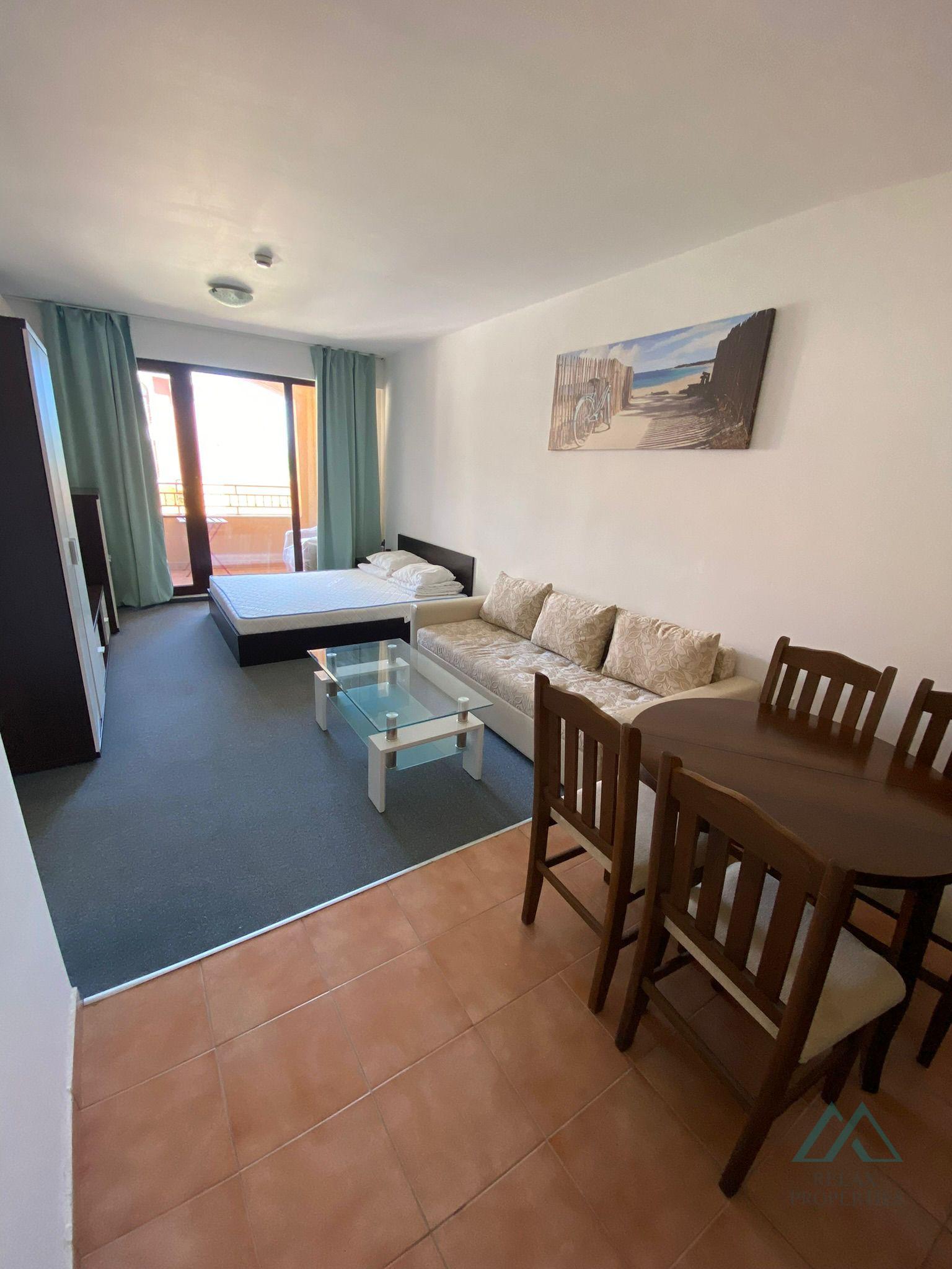 Reference number: B_9063 We offer for sale a spacious studio apartment directly by the sea with an area of 48 m², located in a four-star complex on the first line by the sea in Marina Cape, in the quiet resort of Aheloy, Bulgaria.