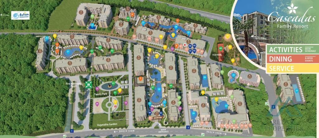 Cascadas Family Resort is a year-round prestigious and gated complex that covers an area of more than 45,000 m². It provides a comfortable environment, rich infrastructure and a variety of leisure and entertainment options for all ages. It is especially popular among families with children.