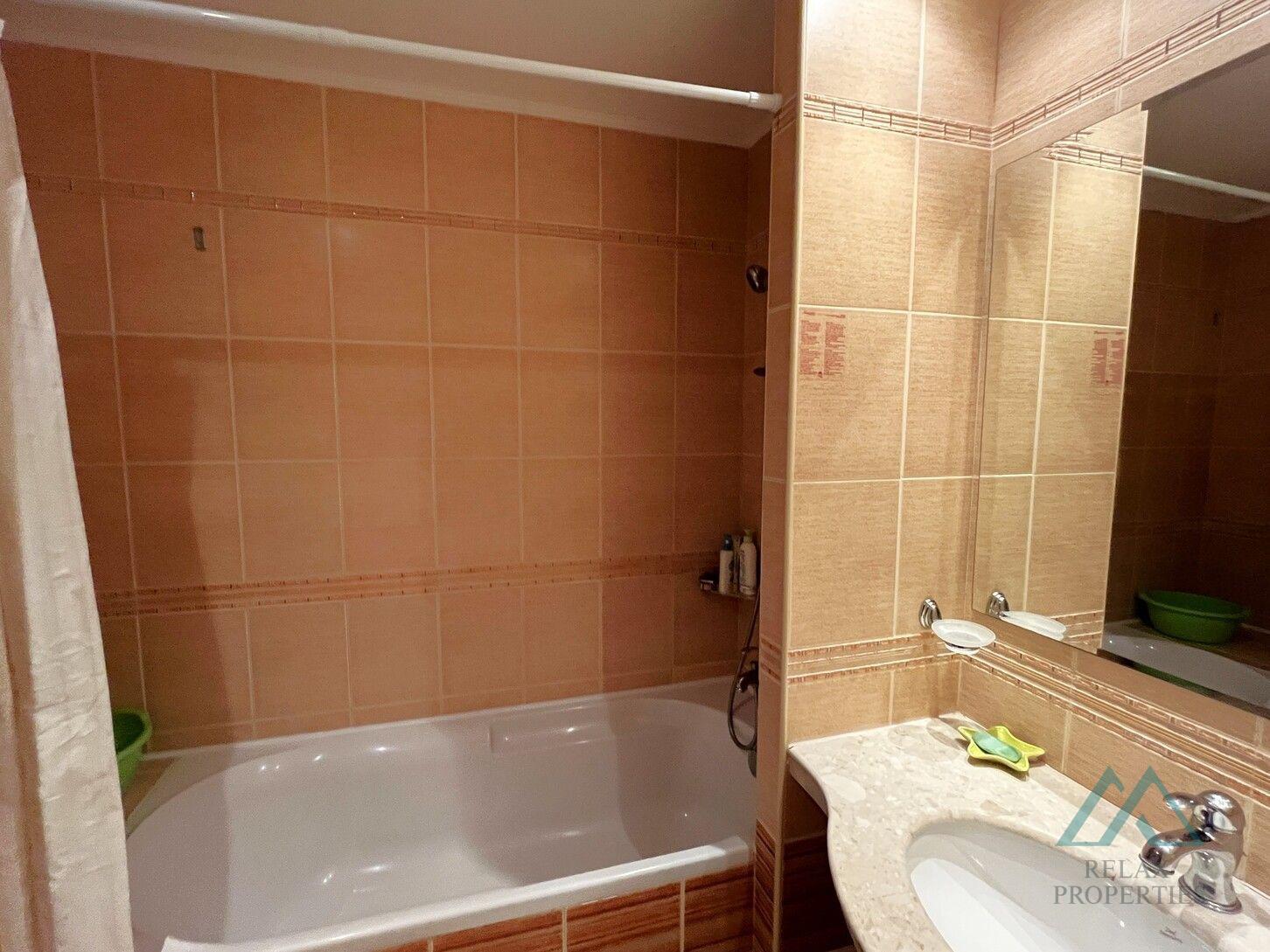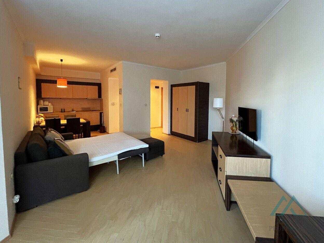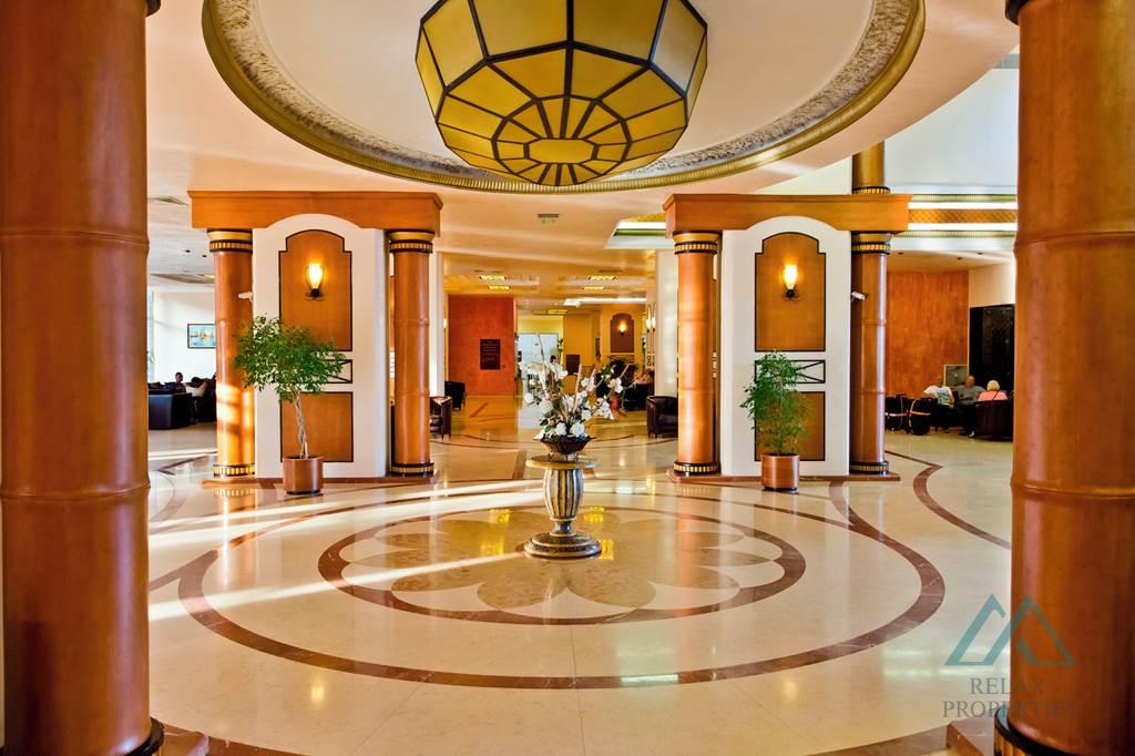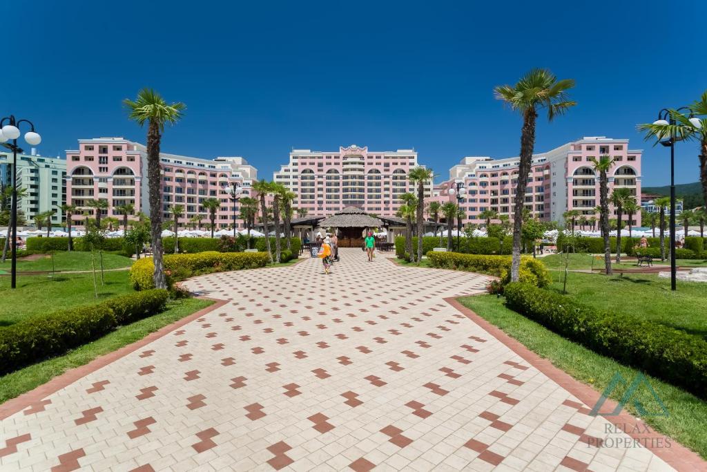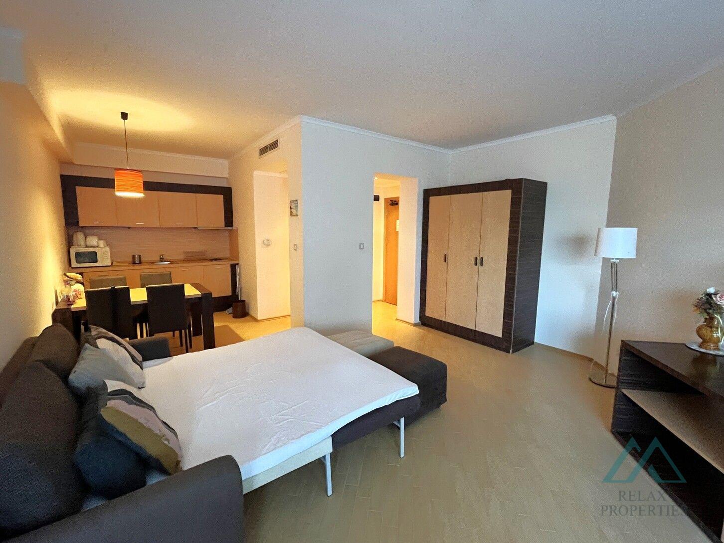 Apartment layout: entrance hall, kitchen connected to the living room, separate spacious bedroom with access to the terrace, large terrace facing the rear – quiet part of the complex with views of the surroundings and greenery. There is only a dead-end street on this side of the complex. The annual management and maintenance fee is €12/m², payable once a year to the complex and includes care of the entire area (swimming pools, park, reception, security service, hotel maintenance, etc.). Apartment owners and their families can use all the resort’s facilities free of charge, including sun loungers, parasols, the fitness center, and entertainment programs. It is also possible to pay extra for meals – breakfast or a full all-inclusive meal plan.