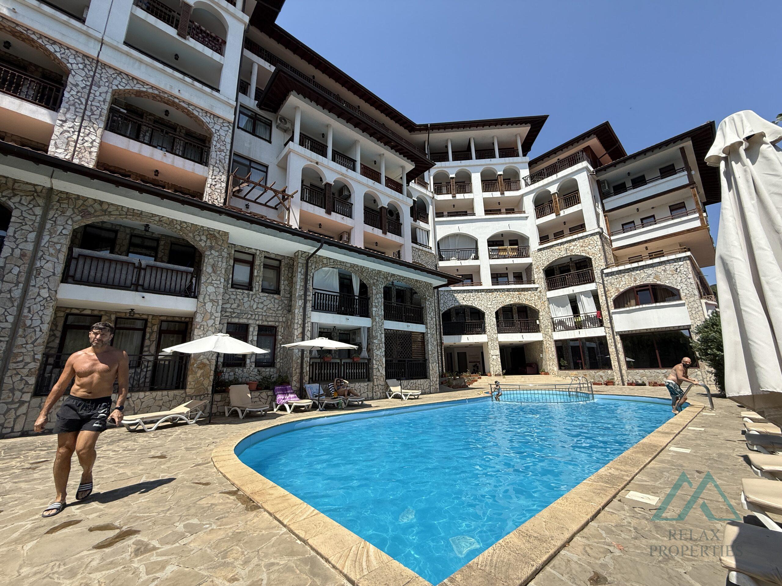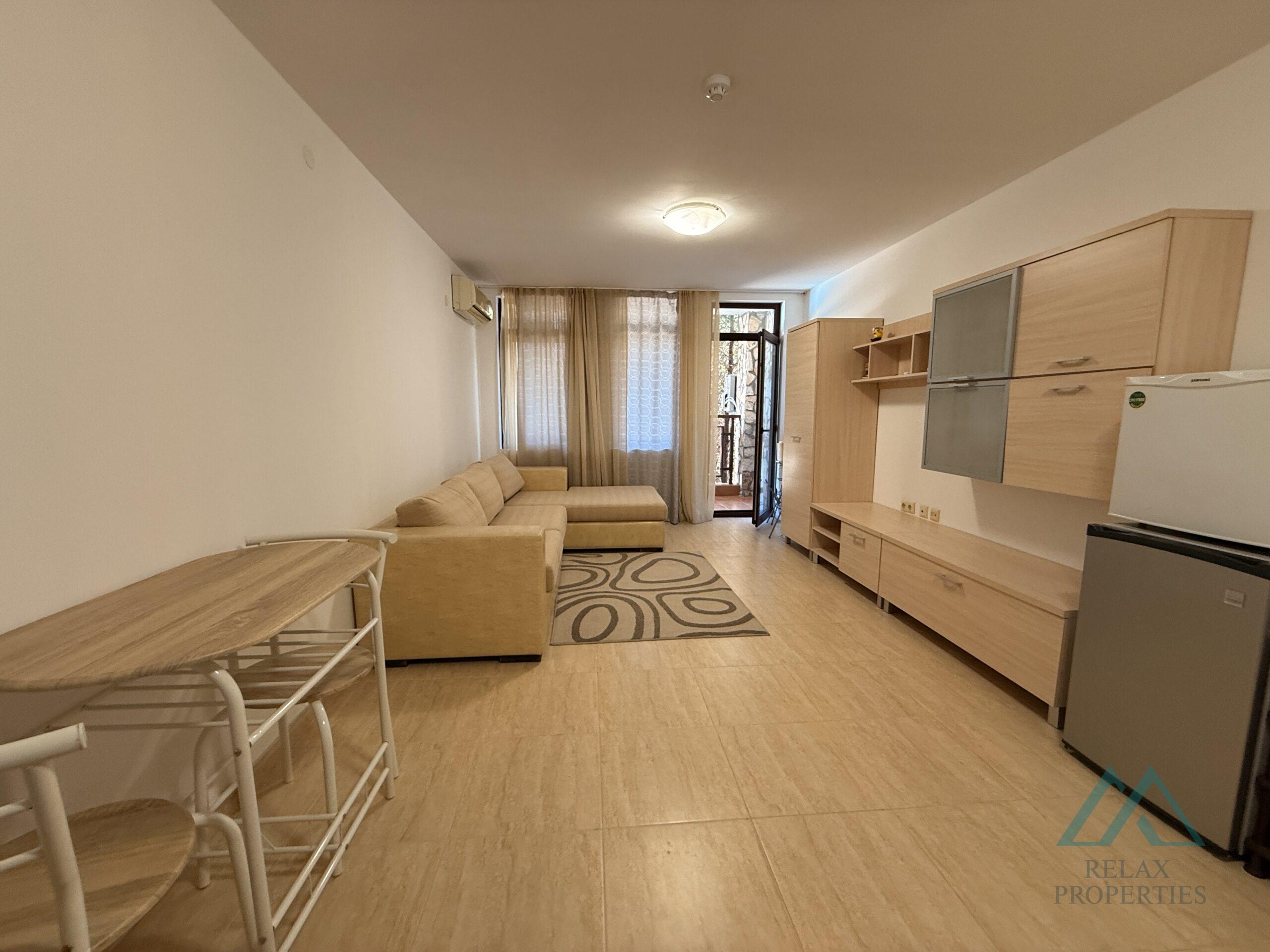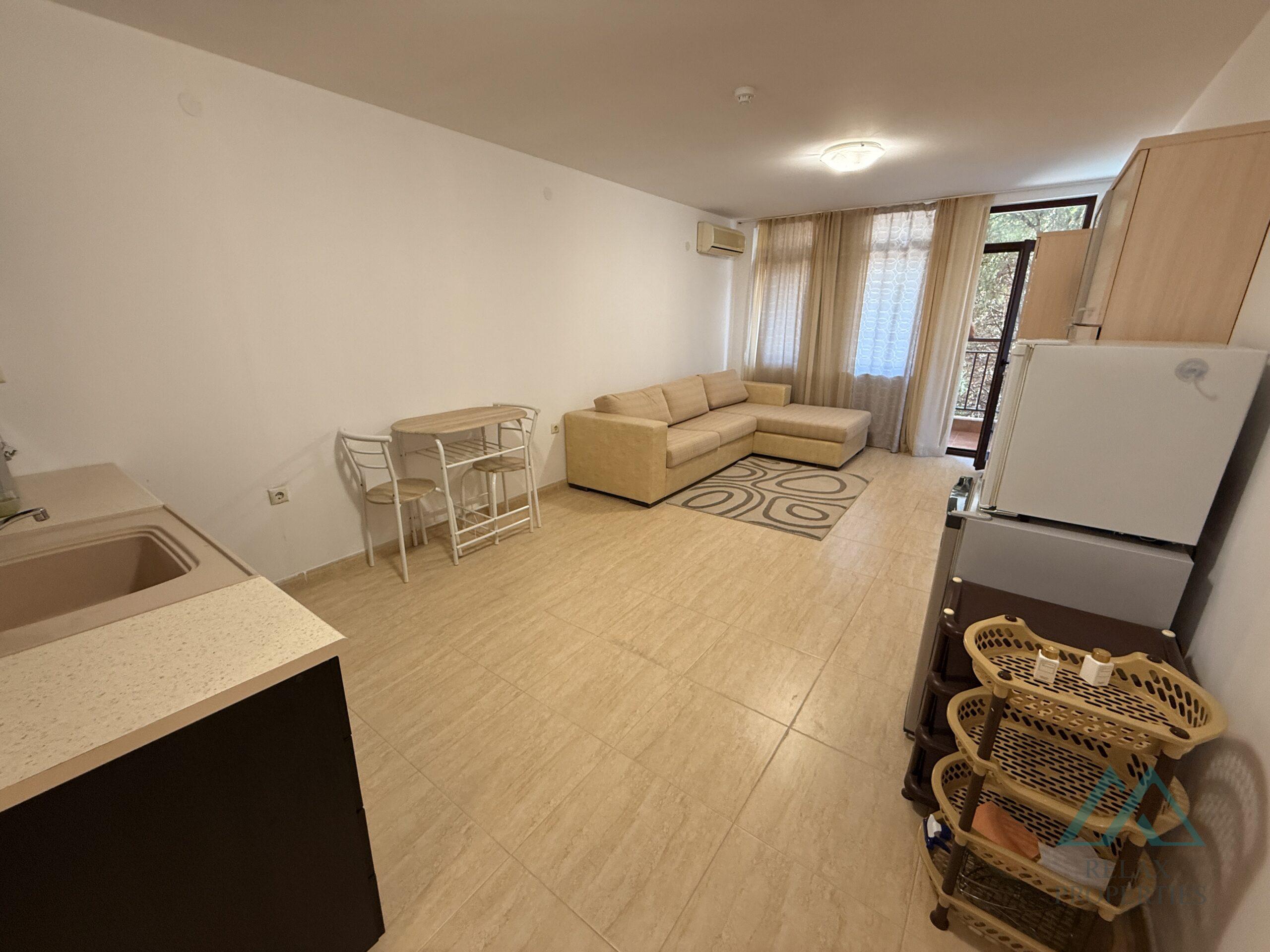 We offer for sale a spacious studio apartment in Etara 3 complex, located just 300 meters from the beautiful beach in Sveti Vlas. The apartment has an area of 38,37 m² and is situated on the 1st floor elevated ground floor. The layout consists of an entrance hall, living room with kitchenette, sleeping area, bathroom with toilet and a terrace overlooking the swimming pool in the complex. The surroundings of the complex are breathtaking close to the forest and greenery, the sea and beautiful beaches.