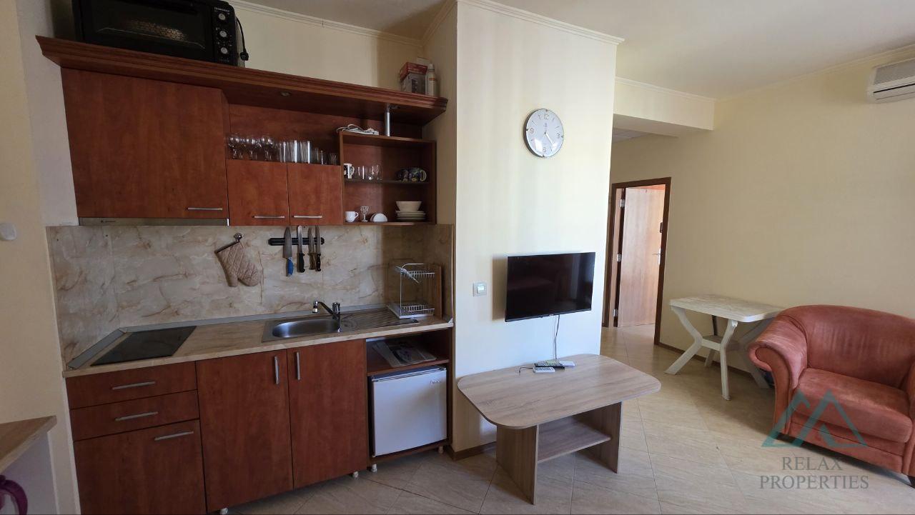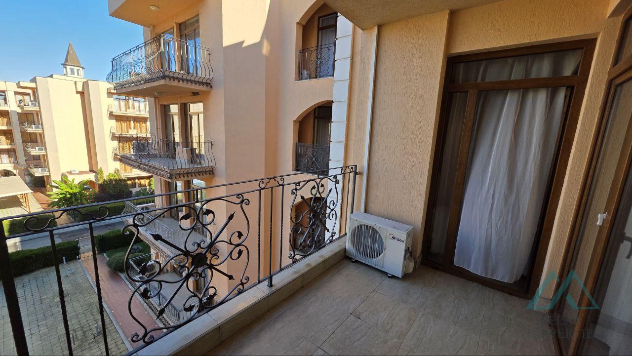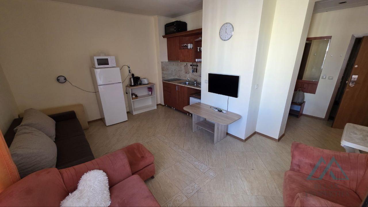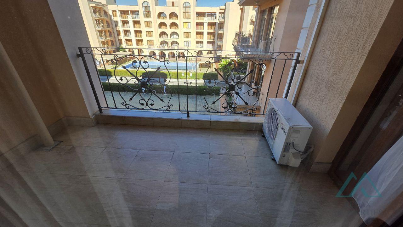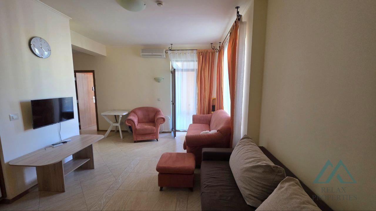 Reference number: B_3605 Relax Properties real estate agency offers you a spacious, very well-maintained and fully furnished 2-room apartment in the popular Palazzo hotel complex in the resort of Sunny Beach, Bulgaria. The complex is located 200 m from the sea and sandy beaches. The complex is open seasonally from May to the end of September. The apartment has an area of 72 m² and is located on the 4th floor with an elevator. It is sold fully furnished and equipped, ready for immediate use or rental. The property is in excellent technical condition, bright, spacious and with a pleasant view of the pool.